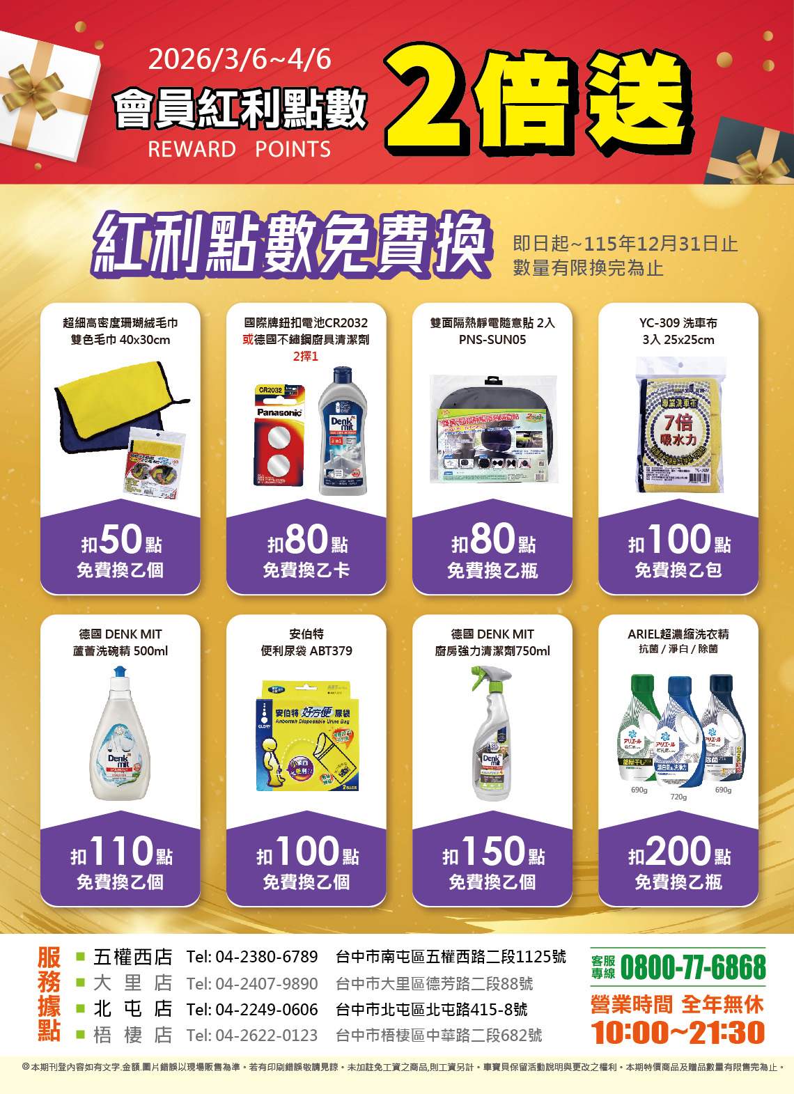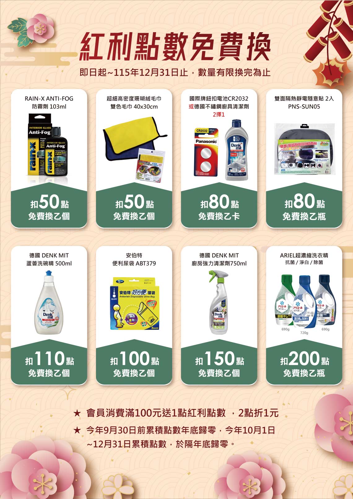 紅利點數 點我看門市型錄 注意事項:會員消費滿100元可累計1點紅利點數,2點可抵1元消費金額;也可扣點數免費兌換紅利商品。紅利點數有效期限1年,使用紅利點數需會員本人使用,或需提供會員本人證件或資料,方可折抵紅利點數。範例:2025年9月30日前累積紅利點數,於2025年底歸零,2025年10月1日~12月31日累積點數,於2026年底歸零。