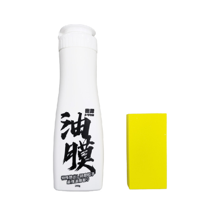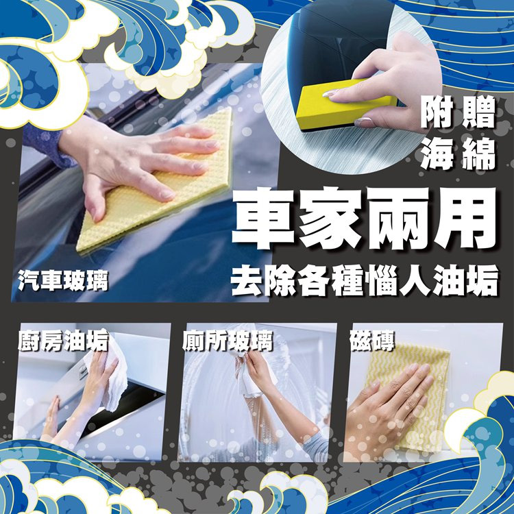 - 2.用海綿沾溼並沾取適量油膜去除劑,開始畫圓塗抹玻璃,讓膏劑分布均勻玻璃表面。