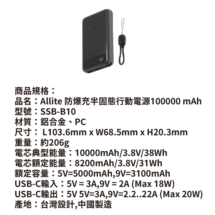 - 品名:Allite 防爆充半固態行動電源100000 mAh