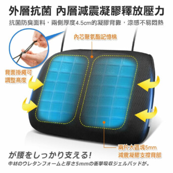 - 中間的聚氨酯記憶棉和5mm減震凝膠牢固支撐下背部。