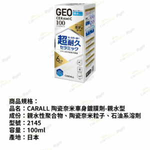 - 品名:CARALL 陶瓷奈米車身鍍膜劑-親水型