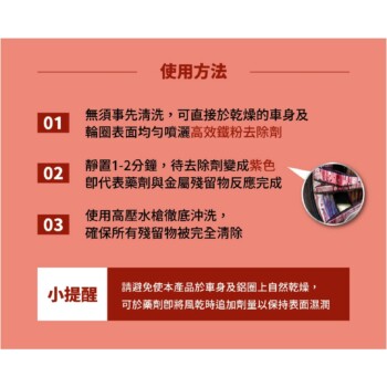 - 1.無需事先清洗,可直接於乾燥的車身及輪圈表面均勻噴灑高效鐵粉去除劑。