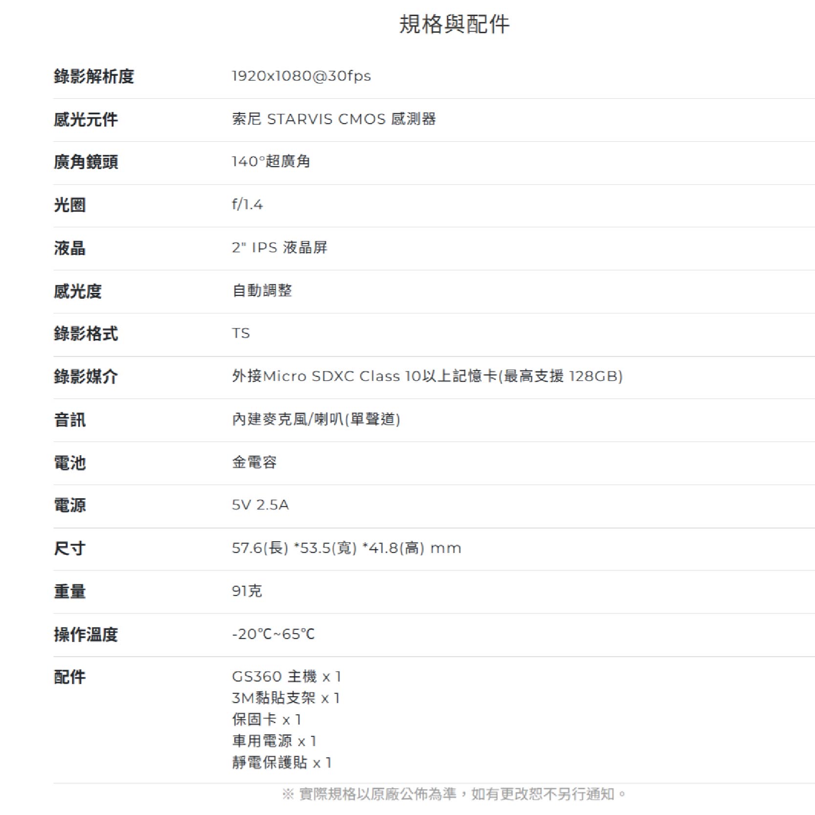 - 錄影媒介:外接Micro SDXC Class 10以上記憶卡(最高支援 128GB)