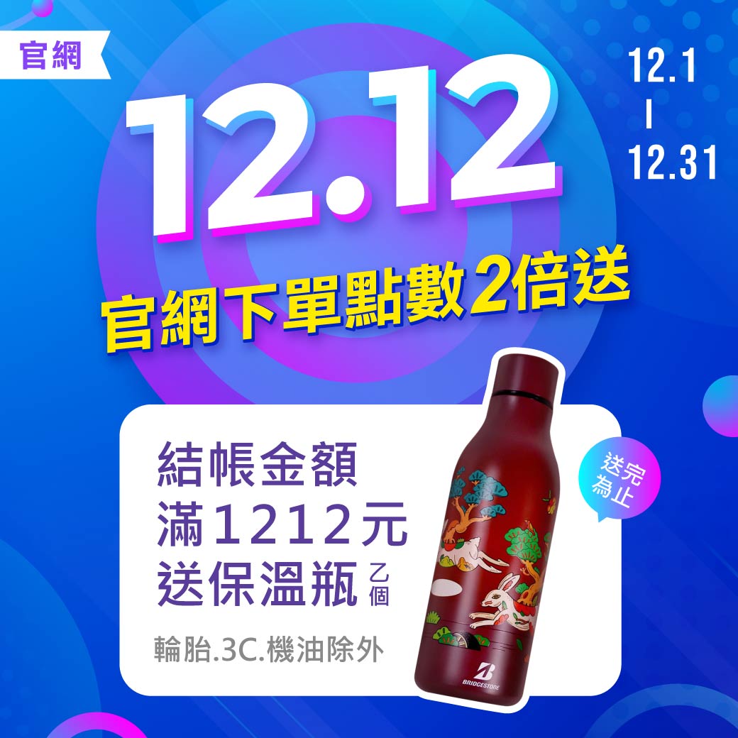 - ★12/1~12/31 雙12~購物金2倍送,結帳金額滿1212元送保溫瓶(送完為止,機油.輪胎.3C除外)