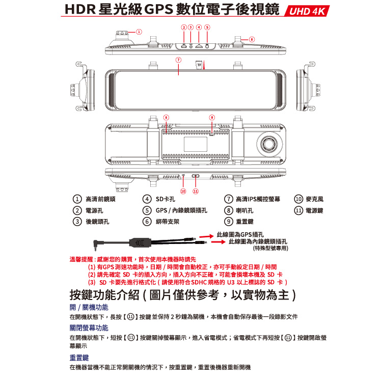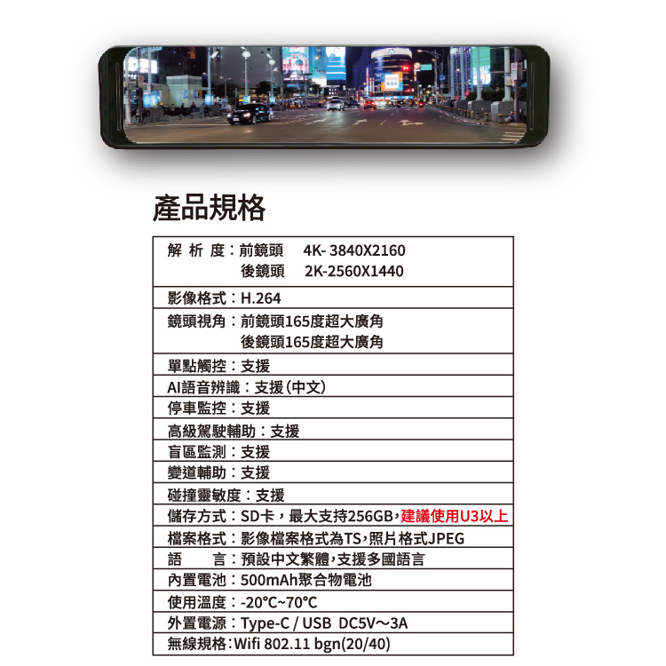 - 記憶卡:SD卡,最大支持256GB,建議使用U3以上(使用前請先用機器格式化記憶卡)