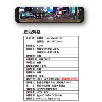 全球鷹 MQ9後照鏡型 前4K後2K WIFI 行車記錄器|贈64G記憶卡