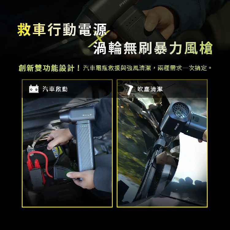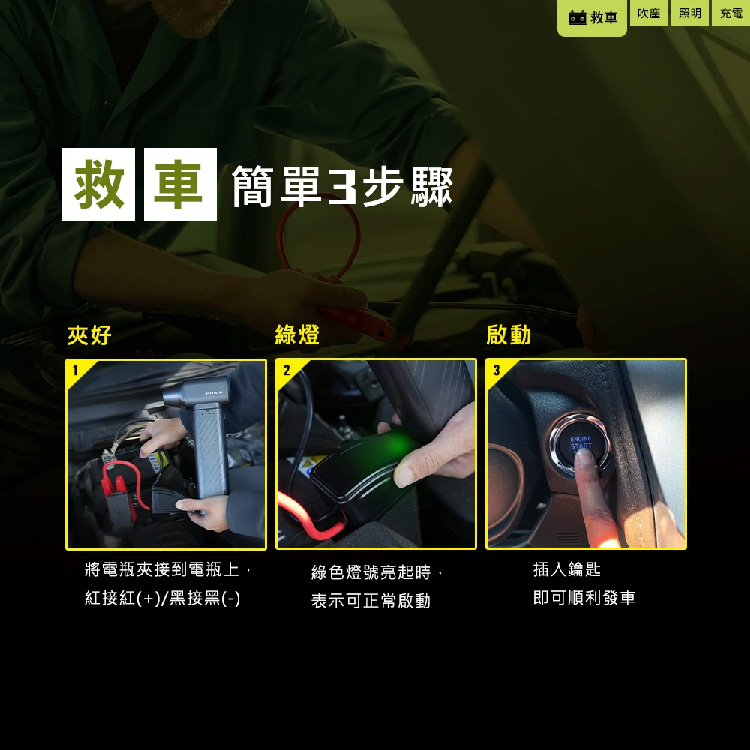 - 救車x吹塵x照明x充電,功能四合一