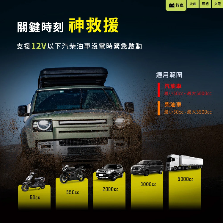 - 支援5000cc以下汽油車與3500cc以下柴油車電瓶緊急啟動