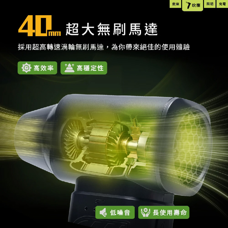- 使用40mm超大無刷馬達,最高檔風速可來到每秒60公尺,等同17級強陣風威力