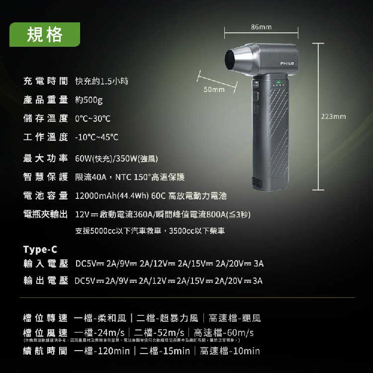 - 額定功率:60W(快充)/350W(強風)