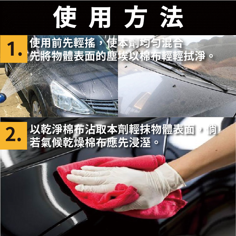 - 以乾淨棉布沾取本劑輕抹物體表面,倘若氣候乾燥棉布應先浸溼。