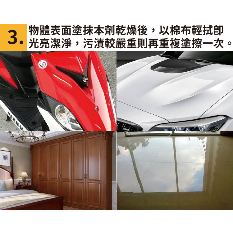 - 物體表面塗抹本劑乾燥後,以棉布輕拭即光亮潔淨,污漬較嚴重則再重複塗擦一次。