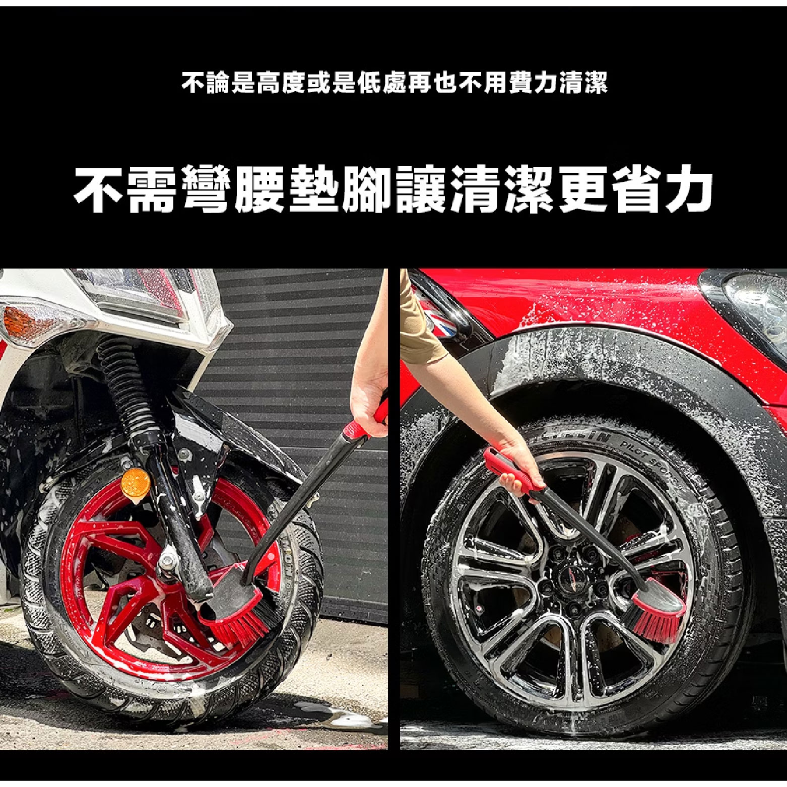 - 快速清理輪胎、鋼圈及車身高處的污垢,無論高處還是細節都能應對自如