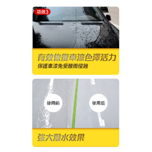 - 蠟質附著車漆表面結合成鍍膜形成緊密保護層,汙垢雜質難以滲透。