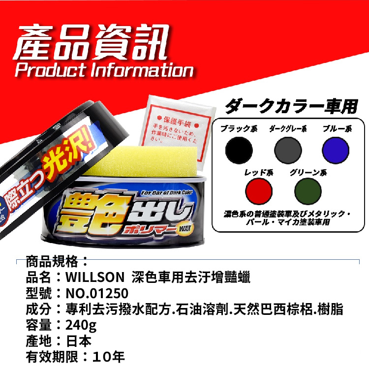 - 品名:WILLSON 深色車用去汙增豔蠟